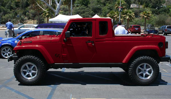 Chrysler Groups Skunkworks has put together a sweet truck built on the Wrangler Unlimited platform. Seemed like it was only a matter of time. It is complete with flat paint, painted steel rims, and a 3" lift. You can check out the rest of it from this MotorTrend.com blog or this Autoblog.com post.